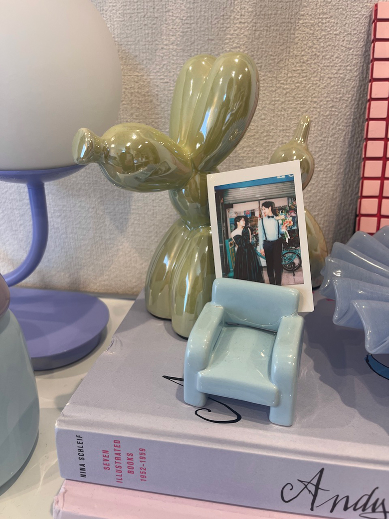 一つ目は、手持ちの小さなインテリアアイテムにチェキプリント™を添えて飾るアイデア。花瓶など家の中にあるちょっとした置物に添えるだけで、お部屋の雰囲気をかんたんに変えることができます。旅先で購入したお土産に、その場所で撮影したお気に入りの一枚を添えるなどセットで揃えるのもおすすめです◎
