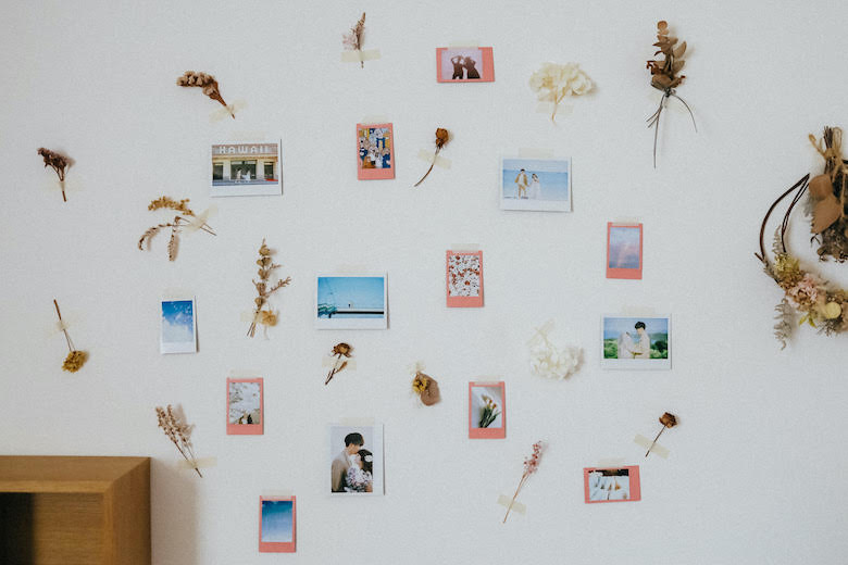 壁にドライフラワーとチェキプリント™を組み合わせて貼り付けるキュートなアイデア。チェキプリント™のまわりにドライフラワーを散りばめるだけで華やかな印象をプラスできます◎ 全体のバランスを調整しながら、少しずつ足していくのがポイント。