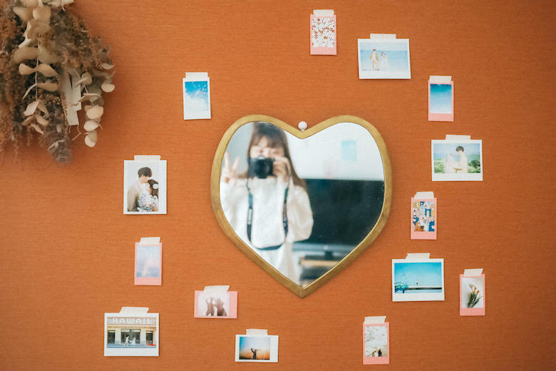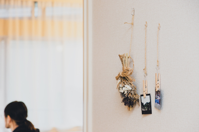 また、花束になったドライフラワーを吊るして、同じスペースにチェキプリント™をランダムに貼り付けるのもかんたんなアレンジ方法です。ミラーを飾ってみたり、ポストカードを貼ってみたり、“好きなもの”で埋め尽くした自分だけの空間を作れます。